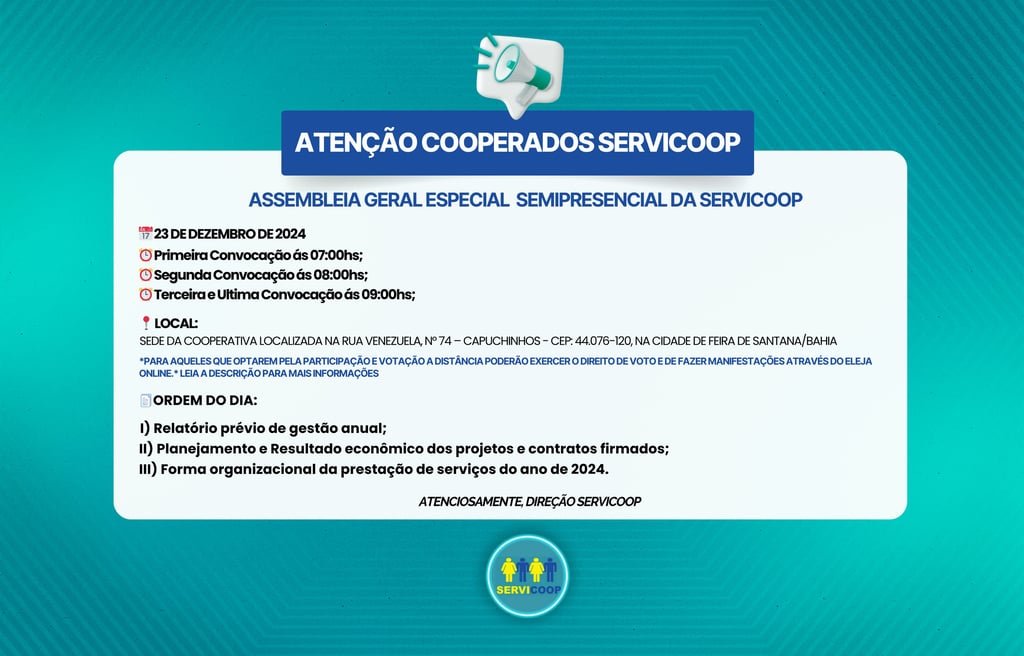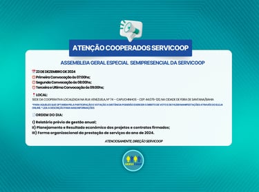 Comunicamos a todos os cooperados da SERVICOOP, conforme publicação do edital no jornal Correio, em edição de 12 de dezembro de 2024, fls.11, convocamos a todos para a participação da AGESP - ASSEMBLEIA GERAL ESPECIAL SEMIPRESENCIAL, que se realizará na Rua Venezuela, n° 74 – Capuchinhos - CEP: 44.076-120, na cidade de Feira de Santana/Bahia no dia 23 de dezembro de 2024.