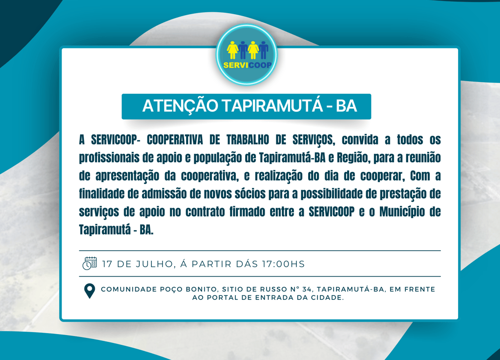 A SERVICOOP- COOPERATIVA DE TRABALHO DE SERVIÇOS, inscrita no CNPJ Nº 28.966.614/0001-41, convida a todos os profissionais de apoio e população de Tapiramutá-BA e Região, para a reunião de apresentação da cooperativa, e realização do dia de cooperar, com a finalidade de informações sobre a cooperativa e admissão de novos sócios, para a possibilidade de prestação de serviços de apoio no contrato firmado após o processo licitatório 013/2024 entre a SERVICOOP e o Município de Tapiramutá -BA que se realizará no dia 17/07/2024 às 17:00, na Comunidade Poço Bonito, Sitio de Russo nº 34, Tapiramutá-BA, em frente ao Portal de Entrada da cidade. Para maiores informações entre em contato: - Através do nosso telefone: 75 3224-3311, - E-mail: servicoopfinanceiro@gmail.com - Instagram: @servi.coop. Atenciosamente Direção SERVICOOP.