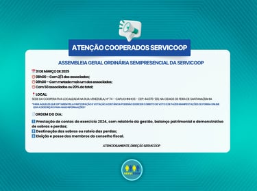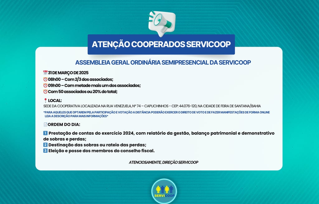A SERVICOOP – Cooperativa de Trabalho de Serviços convoca seus associados para a Assembleia Geral Ordinária, que será realizada de forma semipresencial no dia 31 de março de 2025, na sede da cooperativa, localizada na Rua Venezuela, nº 74 – Capuchinhos, Feira de Santana/BA.