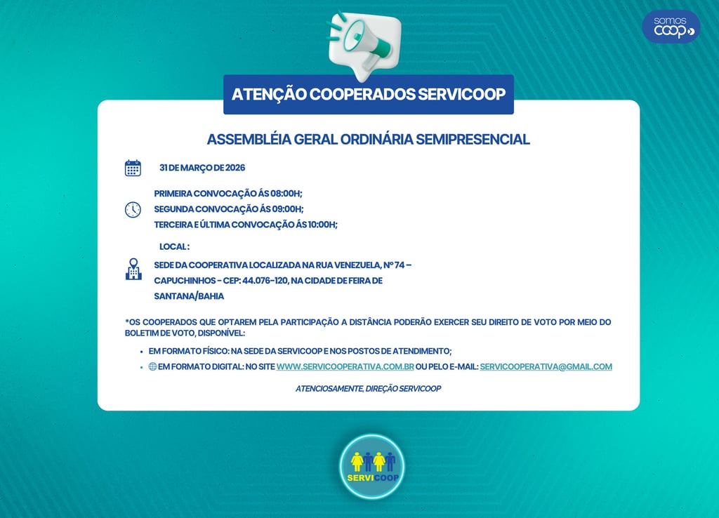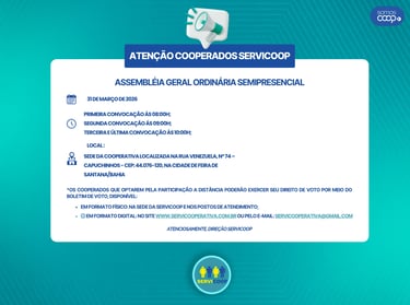 A SERVICOOP – Cooperativa de Trabalho de Serviços convoca todos os seus cooperados para participarem da Assembleia Geral Ordinária (AGO), a ser realizada na modalidade semipresencial.